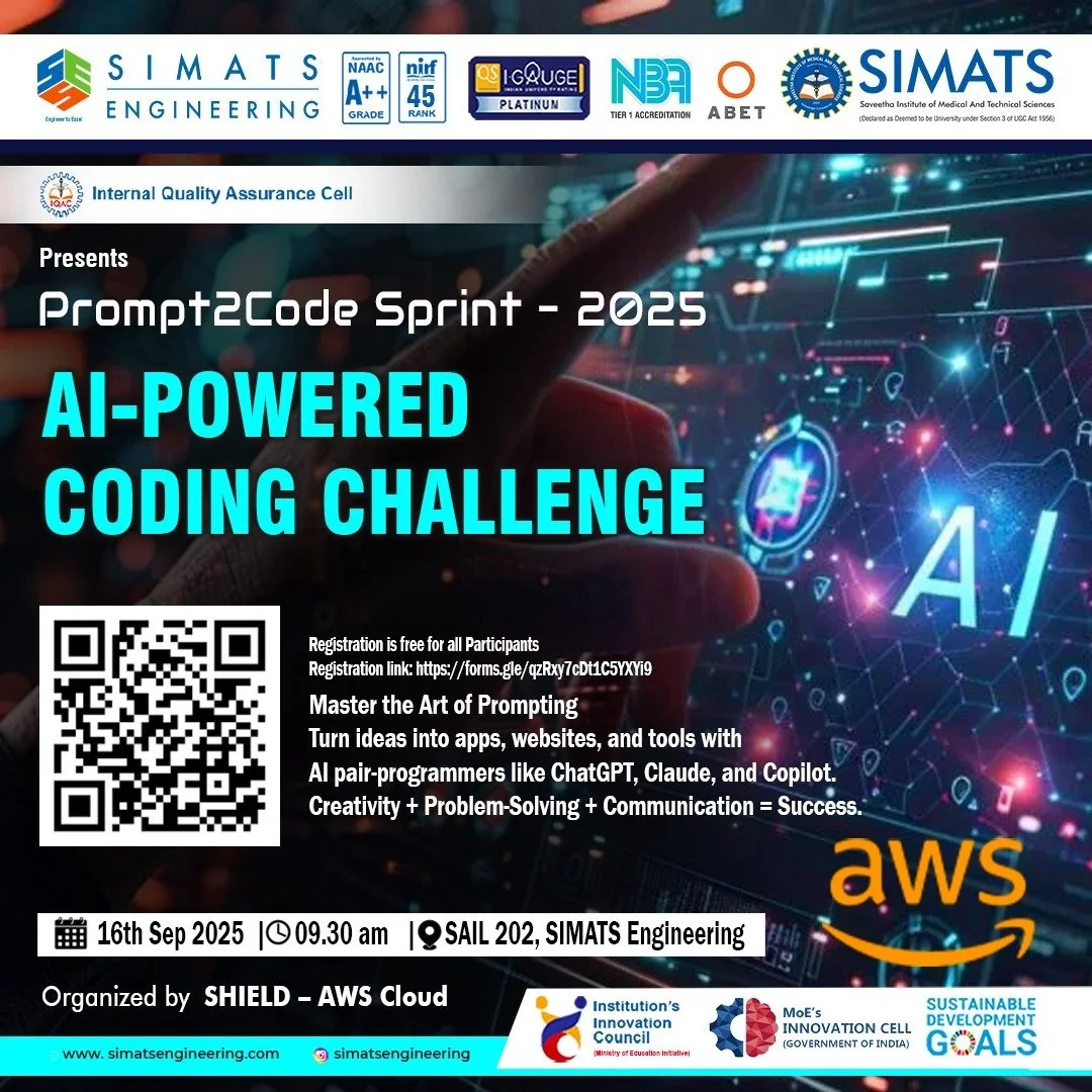 We warmly welcome all students to participate in “Prompt2Code Sprint – 2025”, an AI-powered coding challenge organized by the AWS Cloud – CoE, SIMATS Engineering. Join us on 16th September 2025, 9:30 AM at SAIL 202, SIMATS Engineering and master the art of prompting to transform ideas into apps, websites, and tools with AI pair-programmers like ChatGPT, Claude, and Copilot. Registration is free, and all participants will receive E-Certificates!