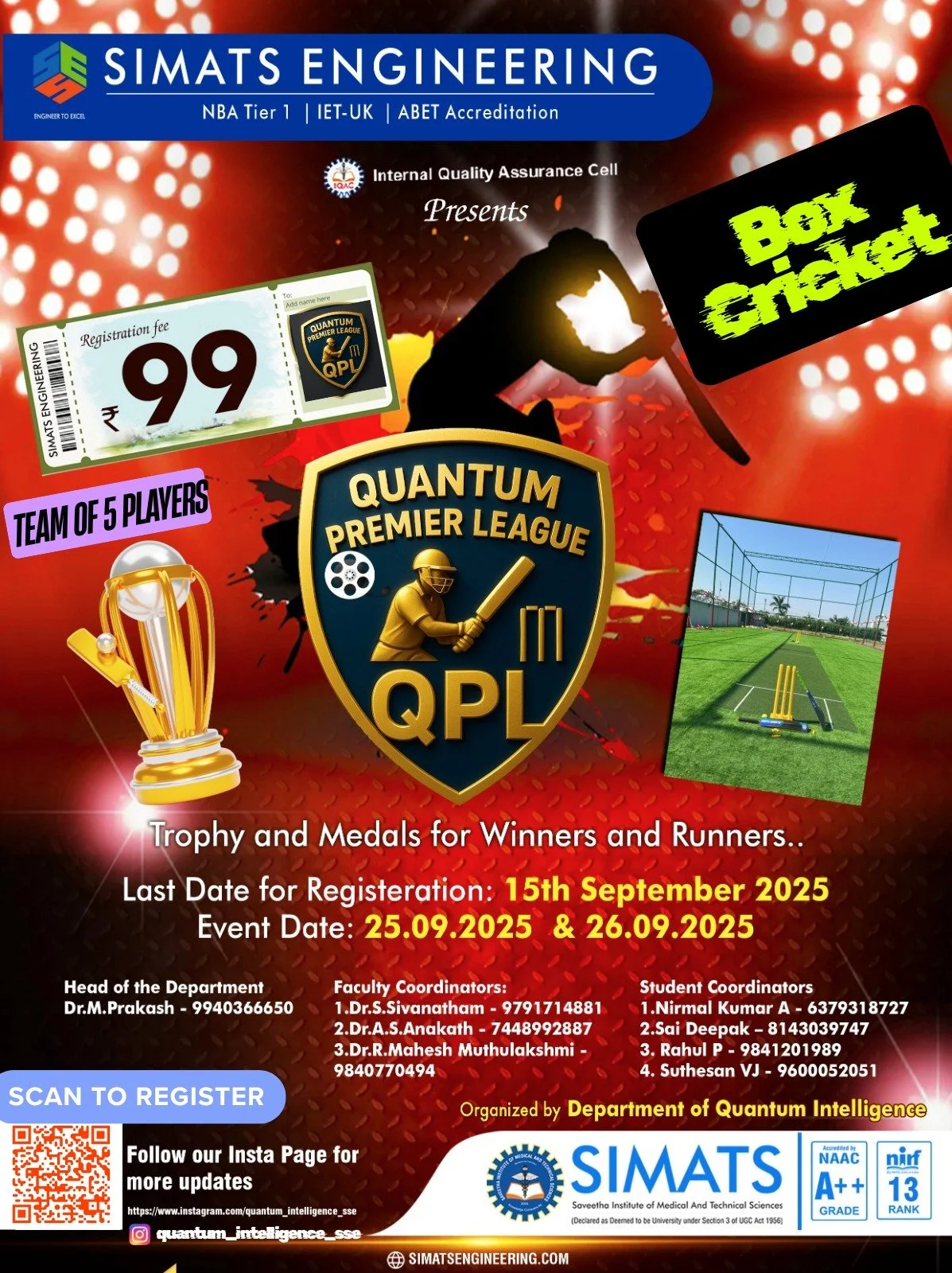 Get ready for the Quantum Premier League – Box Cricket at SIMATS Engineering, Department of Quantum Intelligence! 🏏✨ Form your team of 5 and compete for exciting trophies, medals, and the ultimate cricketing glory.
