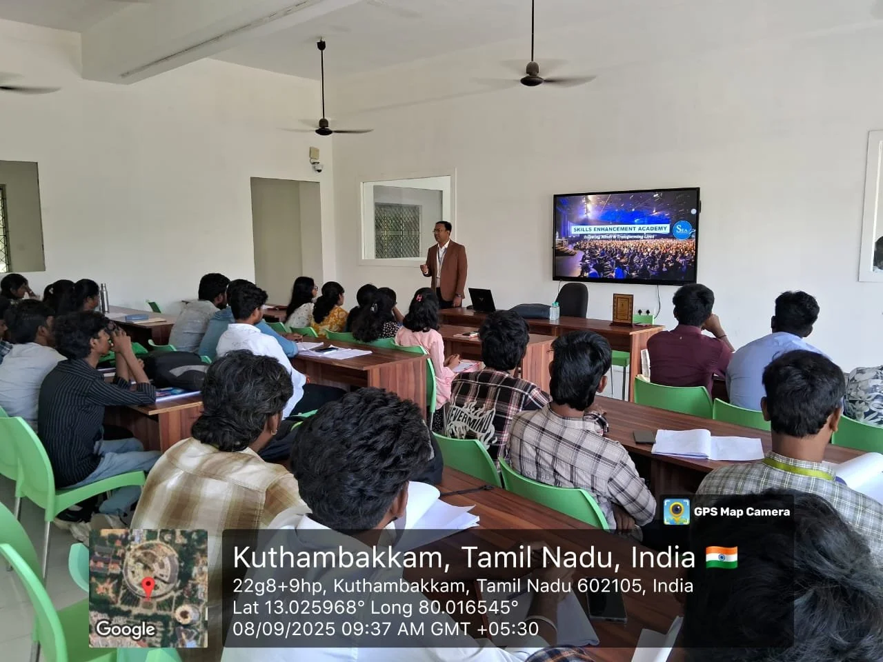 The Department of Electric Power Technology, SIMATS Engineering, successfully organized a One-Day Seminar on “Introduction to Emotional Intelligence: Understanding and Managing Emotions for Personal and Professional Growth” on 13th September 2025. We extend our heartfelt gratitude to the Resource Person, Mr. Simon Anandh Raj, CEO/Founder of Freewill Human Empowerment and Emotional Intelligence Coach, Chennai, for delivering an insightful and engaging session that highlighted the essential pillars required for entrepreneurial success. The program witnessed enthusiastic participation from more than 62 students and five faculty members, making it a memorable success. We sincerely thank all the participants and faculty members for their active involvement and valuable contributions.