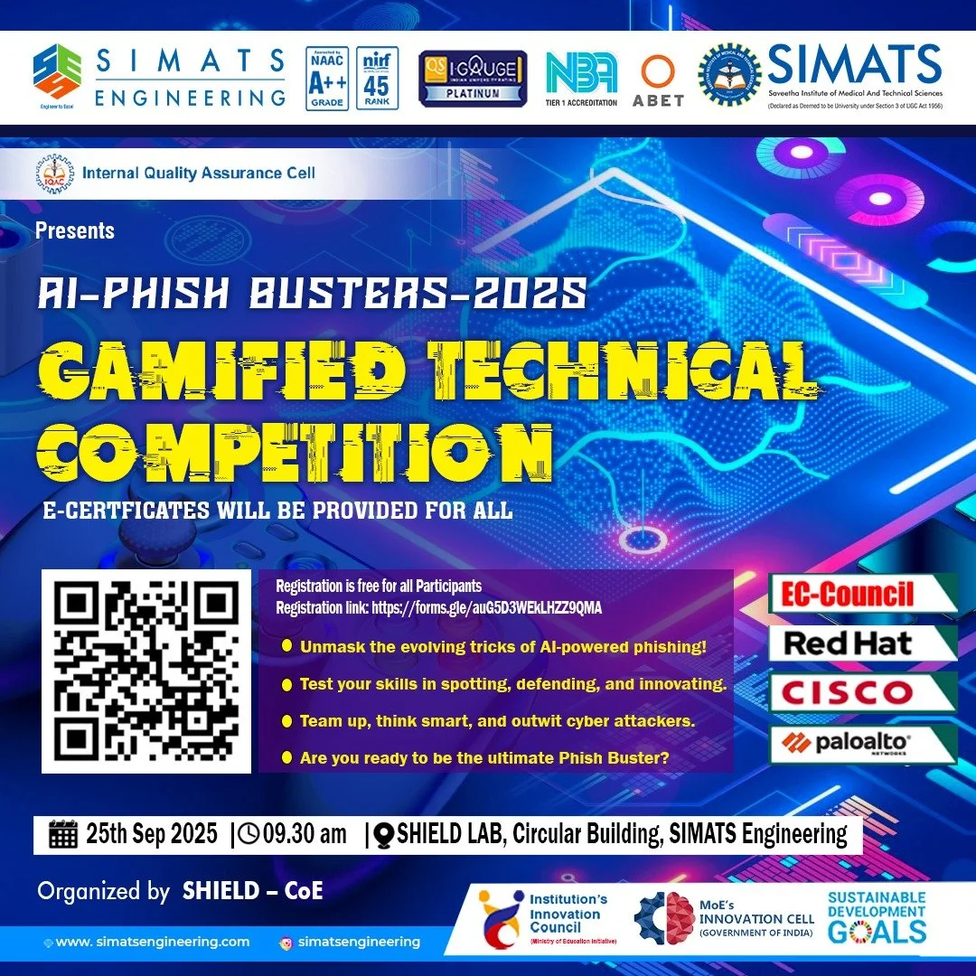 SHIELD – Centre of Excellence, SIMATS Engineering invites you to AI-PHISH BUSTERS-2025, a gamified cybersecurity competition to unmask AI-powered phishing tricks. Join us on 25th September 2025 at 9:30 AM in the SHIELD Lab, Circular Building, and test your skills in spotting and defending against phishing attacks. Registration is free for all participants, and E-Certificates will be provided.