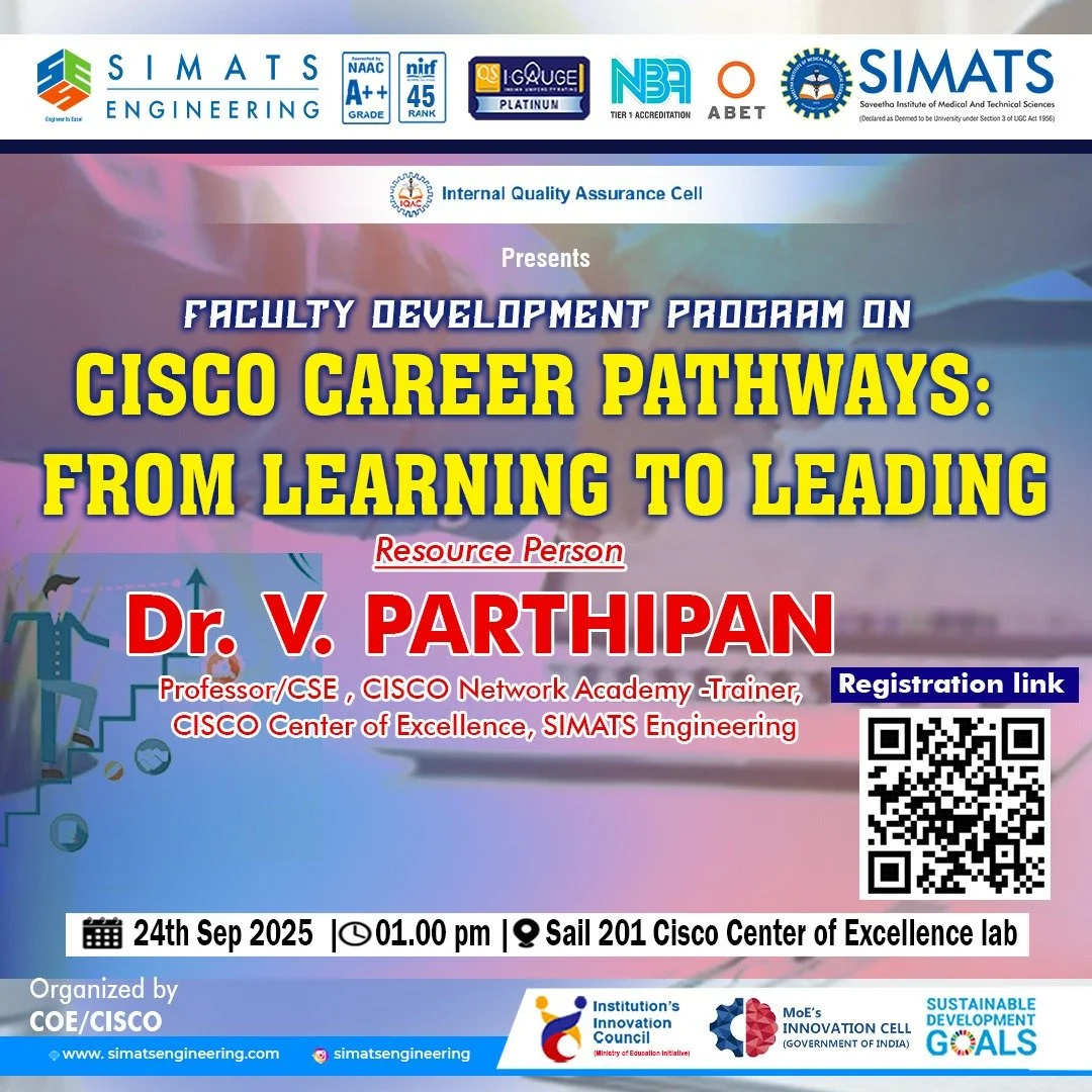 The Center of Excellence in Cisco Networking Academy is pleased to invite you to a One-Day Faculty Development Program on the topic “Cisco Career Pathways: From Learning to Earning”, scheduled on 24th September 2025 at 1:00 PM in SAIL 201 Cisco Lab, Second Floor, Circular Building. The session will be conducted by Dr. V. Parthipan, Professor, Department of Cloud Computing, Center of Excellence – Cisco Networking Academy, SIMATS Engineering. This FDP aims to provide valuable insights into the Cisco career ecosystem, highlighting the journey from learning to earning, and we warmly welcome your active participation. Registration can be completed at: https://forms.gle/D5XnrSRC3BCbZGJ86.