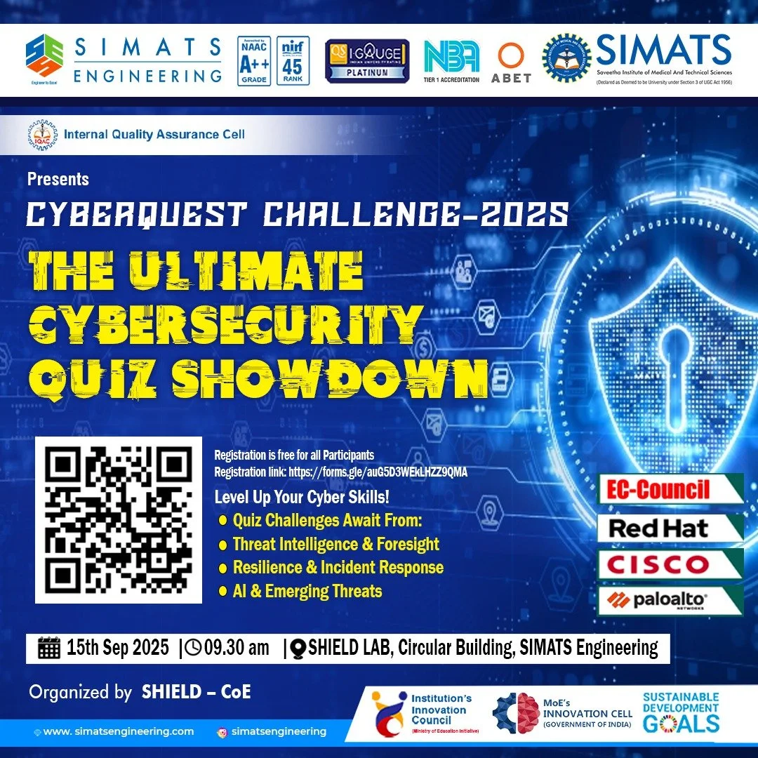 We are thrilled to present “CYBERQUEST CHALLENGE – 2025”, the ultimate cybersecurity quiz showdown designed to test your knowledge and sharpen your skills through exciting challenges in Threat Intelligence, Incident Response, and AI & Emerging Threats. The event will be held on 15th September 2025 at 9:30 AM in the SHIELD Lab, Circular Building, SIMATS Engineering. We also warmly invite all students and faculty to explore our state-of-the-art SHIELD CoE lab facilities, where you can discover opportunities for professional training and certifications, capstone projects, research collaborations, article publications, consultancy projects, and other academic activities. Registration is completely free, and all participants will receive recognition through E-Certificates. Register now at https://forms.gle/auG5D3WEkLHZZ9QMA and level up your cyber skills while competing for glory. For any queries, please feel free to reach out to us.