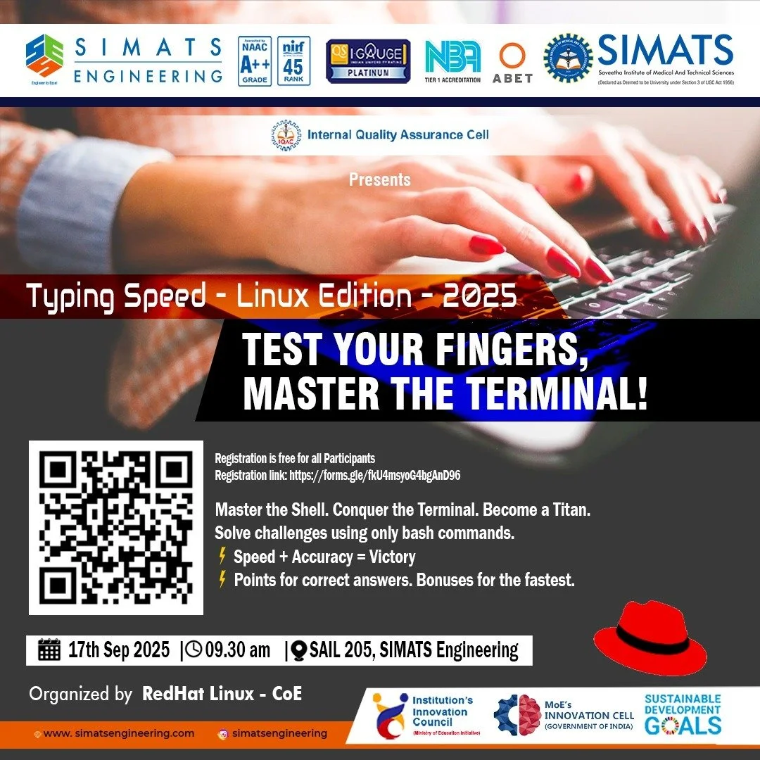 We invite all students to participate in “Typing Speed – Linux Edition 2025”, a fun and challenging event organized by the RedHat Linux – CoE, SIMATS Engineering. Put your typing skills to the test and master the Linux terminal on 17th September 2025, 9:30 AM at SAIL 205, SIMATS Engineering. Compete by solving challenges using only bash commands — where Speed + Accuracy = Victory! Points will be awarded for correct answers, with exciting bonuses for the fastest. Registration is free, and all participants will receive E-Certificates.