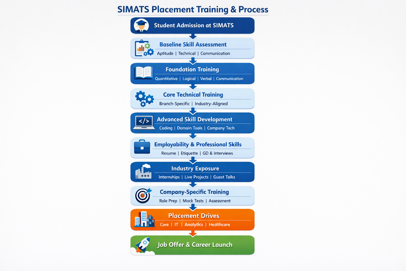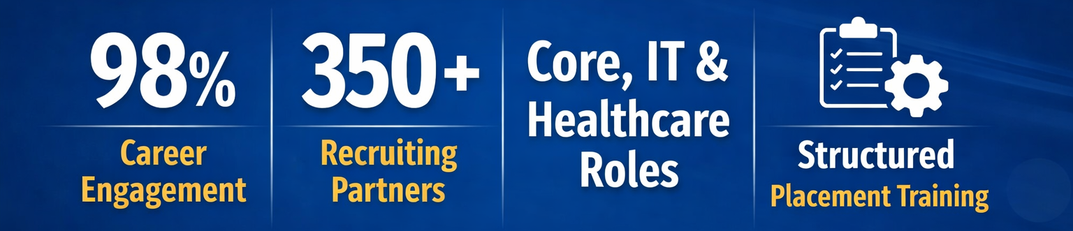 At SIMATS Engineering, placements are treated as a continuous developmental process rather than a final-year activity. Career preparation begins from the early stages of the academic program and progresses through structured training, mentoring, certification courses, and industry exposure. This systematic approach ensures that students graduate with not only academic knowledge, but also professional competence, confidence, and clarity required to succeed in the competitive job market.
