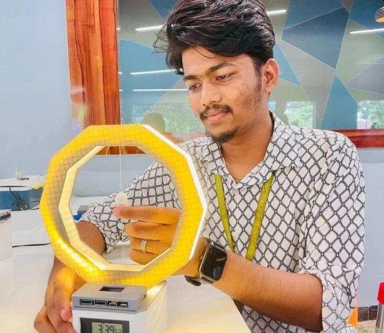 Third-year student A. Manideep created an electromagnetic levitation system using feedback control within an illuminated hexagonal frame as part of the Product Design and Development course. The product precisely levitates objects with real-time height tracking on a digital display.
